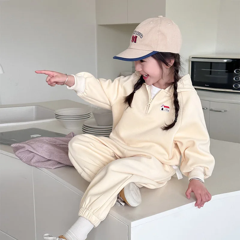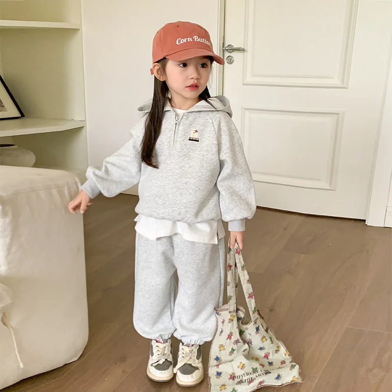 Custom Girls Clothing Sets Casual Two-Piece Hoodie Sweat Suit with Cute Cartoon Embroidery Patch Print Pattern